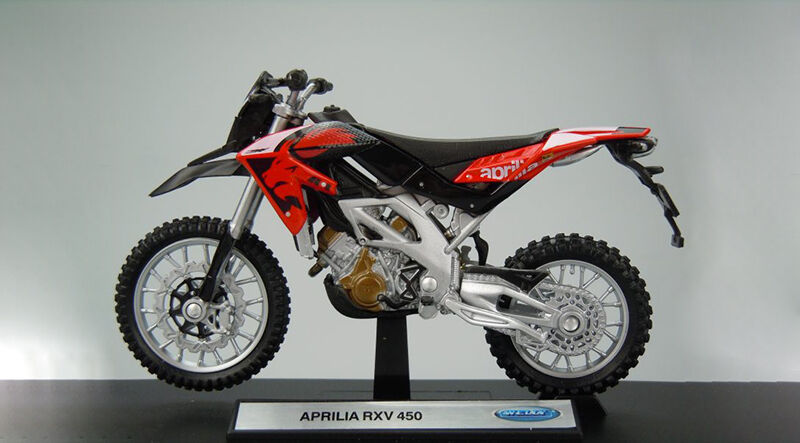 Model motocyklu Aprilia RXV 450 z kovu a plastu má otočná řídítka. Model je dodáván s podstavcem, na který je upevněn šroubem. Dodáváno v různobarevné papírové krabičce s plastovým průhledem.