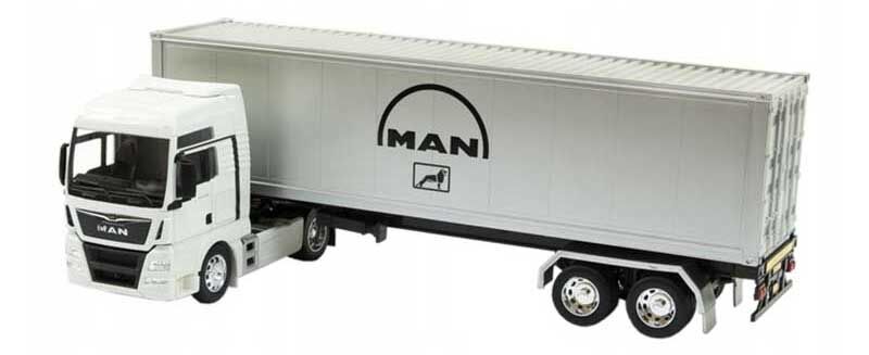 Detailní model tahače MAN TGX s přívěsem je vyrobený z kovu a plastu. Přívěs je odnímatelný a jeho dveře jsou otevíratelné. Baleno v kartónové krabičce s plastovým průhledem.