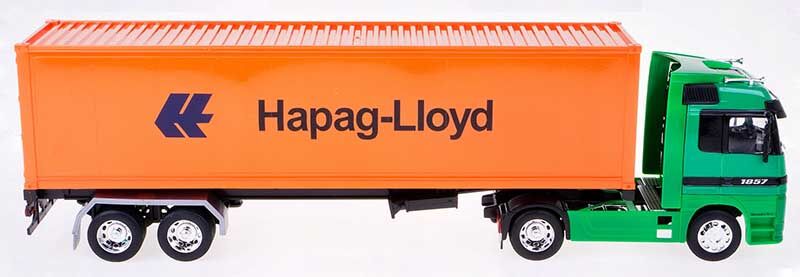 Detailní model tahače Mercedes-Benz Actros s přívěsem je vyrobený z kovu a plastu. Přívěs je odnímatelný a jeho dveře jsou otevíratelné. Baleno v kartónové krabičce s plastovým průhledem.
